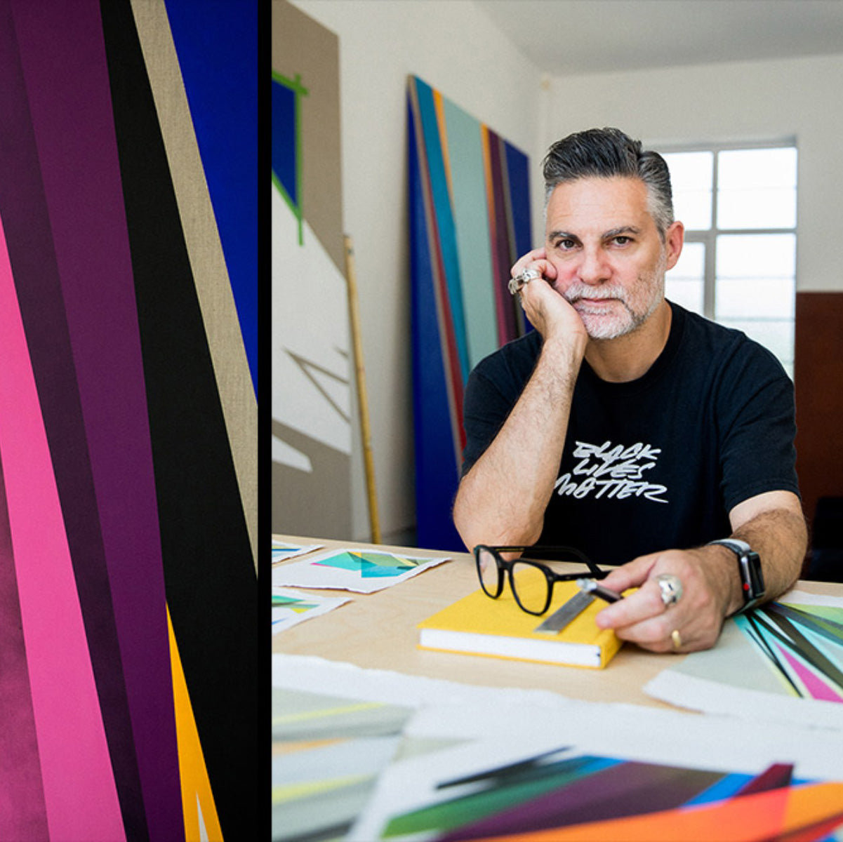 Remi Rough (b. 1971) makes complexly composed abstract paintings that create a strong sense of visual pleasure for the viewer. His formative years and experiences as a style writer, (or as most people would know it, a graffiti artist), inform his precise, constructed artworks. Since the early 2000s he has focused on creating works on surfaces ranging from paper and wood to brick and concrete. His clever use of highly sensory colour evokes an array of different feelings for the viewer and can at times be perceived as musical due to the vibrational energy the work emits.